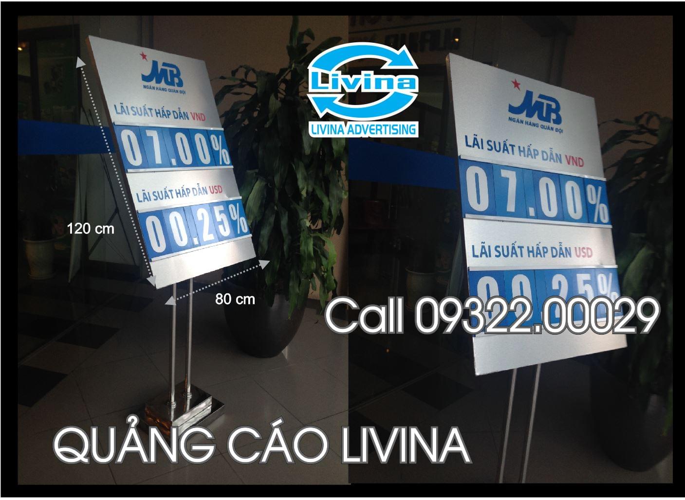 . QUANGCAOLIVINA chuyên cung cấp các loại bảng lãi suất ngân hàng cho ngân hàng. Chúng tôi có trách nhiệm tư vấn thiết kế, thi công và lắp đặt hoàn thiện công trình. Khách hàng có nhu cầu làm bảng lãi suất ngân hàng sẽ được tư vấn nhiệt tình, cụ thể với những thông tin hữu ích nhất.