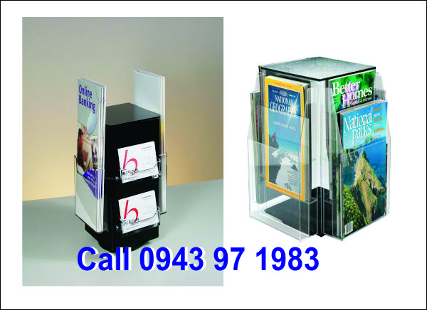 Kệ mica 3 mặt, kệ mica 4 mặt, kệ mica lục giác được thiết kế để đựng tờ rơi gồm 3, 4 hoặc 5 mặt . Phía dưới đế được làm bằng mica trong, mica màu có in logo theo yêu cầu. Dưới đế có gắn cơ cấu làm xoay phần thân giúp cho khách hàng dễ dàng tiếp cận thông tin ở các mặt mà không cần phải mất công quay kệ nhiều lần lại để xem. Kệ được thiết kế có thể xoay được 360º khá dễ dàng. Kệ mica 3 mặt, kệ mica 4 mặt, kệ mica lục giác có thể làm theo bất kỳ kích thước nào mà khách hàng yêu cầu. Kệ mica 3 mặt, kệ mica 4 mặt, kệ mica lục giác nhẹ, dễ dàng vận chuyển và vệ sinh sản phẩm.