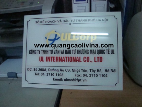 Công ty QUANGCAOLIVINA.COM là địa chỉ chuyên làm biển quảng cáo cho các công ty, các văn phòng trên cả nước, chúng tôi có làm biển khắc mica tại Hà Nội, biển chức danh để bàn, biển chức danh đề tên bộ phận, đề tên khu vực nào đó, biển tên để bàn nhân viên, biển đề tên và chức vụ của lãnh đạo phòng ban, biển đề tên phòng ban treo bên ngoài cửa phòng Làm biển khắc mica tại Thành Phố Hồ Chí Minh, Làm biển khắc công ty , Biển công ty khắc mica, Khắc laser, khắc 3D, Biển công ty mica có led.