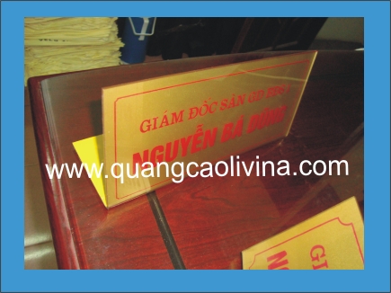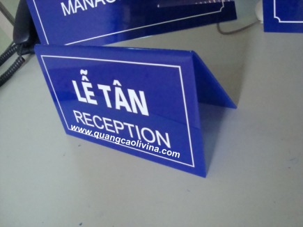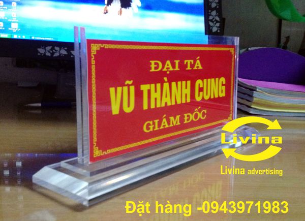 Biển mica để bàn hay còn gọi là biển chức danh để bàn, kệ chức danh mica được sử dụng rất phổ biến. QUANGCAOLIVINA.COM là xưởng gia công mica, chuyên cung cấp biển mica để bàn,biển chức danh để bàn, kệ chức danh mica. Biển mica để bàn của chúng tôi được là từ chất liệu mica cao cấp, với thiết kế đơn giản, tinh tế, đẹp mắt luôn là sự lựa chọn hàng đầu tại các cơ quan, tổ chức, cá nhân.