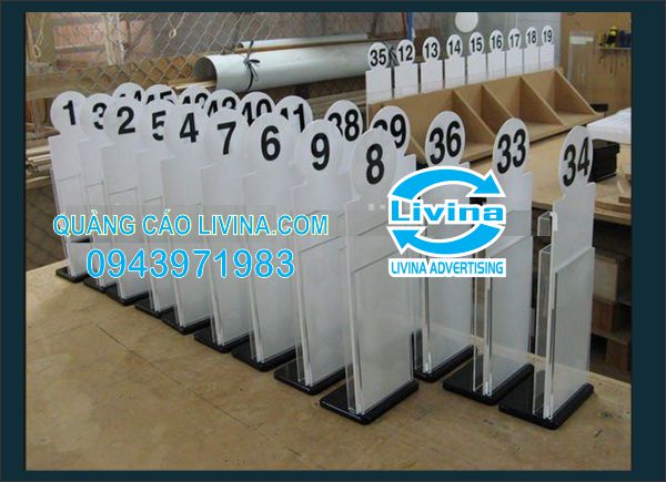 Kệ số bàn nhà hàng, quán café được làm từ mica Đài Loan, với nhiều màu sắc và kích thước để khách hàng lựa chọn. Kích thước và logo in kệ số bàn nhà hàng, quán café hoàn toàn theo yêu cầu của quý khách .