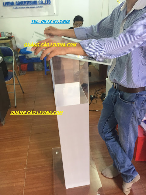 Với sự nghiên cứu cộng với hỗ trợ từ các công nghệ tiên tiến QUANGCAOLIVINA.COM , xưởng sản xuất bục phát biểu đã cho ra đời sản phẩm bục phát biểu mica. Là sản phẩm gia công từ mica thời trang, thanh lịch, tinh tế, được sử dụng hoàn hảo và sang trọng .Bục phát biểu được làm bằng mica Đài Loan. Với kích thước bục phát biểu thông dụng: Thân cao 1.2 mét, mặt kích thước (40*60)cm, chân rộng (40*60)cm. Bục phát biểu làmtừ mica trong Đài Loan từ 8mm trở lên. Ngoài ra, kích thước bục phát biểu còn được làm theo yêu cầu. Có thể in trực tiếp hoặc khắc nội dung lên bục phát biểu, bục phát biểu có thể trang trí led hoặc Bục phát biểu trang trí thêm logo. Bục phát biểu được sản xuất bằng những công nghệ tiên tiến nhất để tạo ra sản phẩm như cắt mica bằng máy cắt laser , máy đánh bóng các cạnh và đội ngũ công nhân viên có tay nghề cao trong lĩnh vực gia công mica lâu năm. Chúng tôi luôn cam kết với quý khách hàng sản phẩm luôn đảm bảo chất lượng , thẩm mỹ , tinh tế, thời gian làm bục phát biểu nhanh, giá của bục phát biểu rẻ.