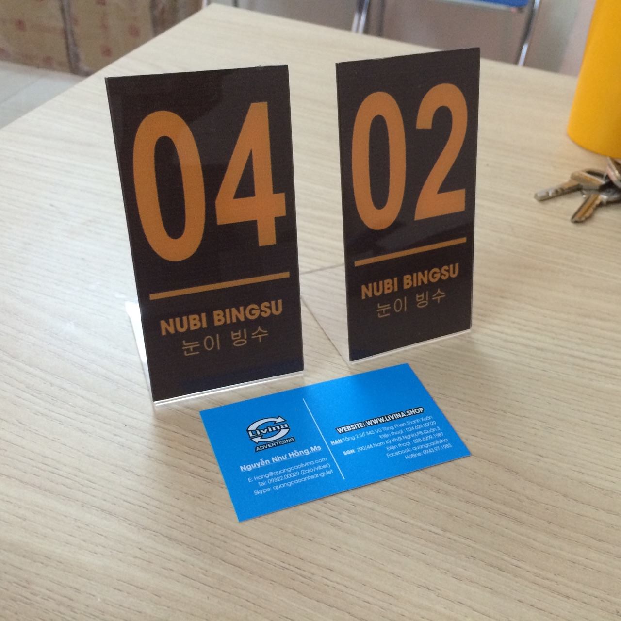 Bằng kinh nghiệm nhiều năm trong việc sản xuất các sản phẩm Biển số bàn mica, biển số để bàn mica chữ L màu, biển số để bàn mica trong, kệ thứ tự tên bàn older bằng mica 2 mặt, kệ số tên bàn cho quán cafê, nhà hàng quán ăn luôn đáp ứng về nhu cầu mẫu mã của quý khách hàng.