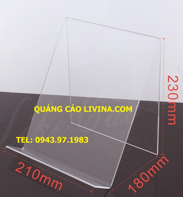 QUANGCAOLIVINA còn chuyên gia công làm kệ để trưng bày sản phẩm mẫu, kệ thông tin sản phẩm, kệ chi tiết sản phẩm. Những mẫu mã, kích thước kệ mica có thể được gia công nhỏ gọn để số thứ tự bàn, kệ mica chia 3 ngăn A5 đứng, 2 ngăn để A4 xếp 3. Kệ giá tên sản phẩmđược làm chất liệu từ Mica được in chìm hoặc in tràn nền, dán decall.