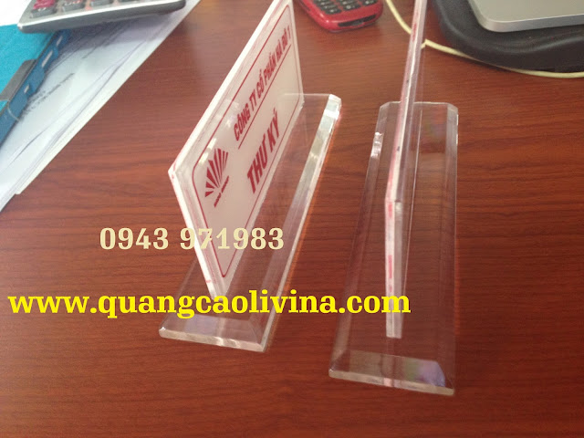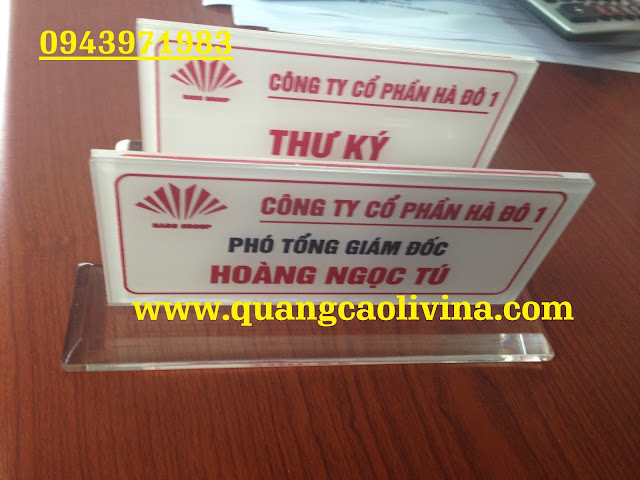 Bản chỉ cần gọi điện và gửi thông tin. QUANGCAOLIVINA.COM sẽ tư vấn và thiết kế miễn phí. Với công nghệ ăn mòn điện phân cho ra các mẫu biển chức danh bằng đồng đế gỗ đẹp sang trọng và lịch sự tương xứng với tầm vóc và giá trị bản thân bạn. Hoặc bạn có thể làm trên chất liệu mica, in biển chức danh để bàn với bề mặt sáng bóng, uốn nhiệt. Giá thành của sản phẩm không đắt chỉ giao động từ đến 250.000 đến 750.000 là bạn có thể sở hữu cho mình một sản phẩm rất sang trọng rồi. Hãy gọi ngay cho QUANGCAOLIVINA.COM khi bạn có nhu cầu nhé.