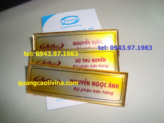 Sau đây là một số loại thẻ nhân viên đang có tại QUANGCAOLIVINA mà khách hàng có thể tham khảo và lựa chọn.Làm bảng tên, in thẻ nhân viên kim loại phủ keo thủy tinh hữu cơ in tên cố định, loại bảng tên này được in trực tiếp lên kim loại mặt nền đồng, mặt nhũ vàng, mặt bạc xước, đồng xước… hoặc nền in màu theo yêu cầu, chất lượng in sắc nét bóng đẹp lịch sự, thẻ tên có thể lựa chọn cài ghim hoặc cài nam châm.