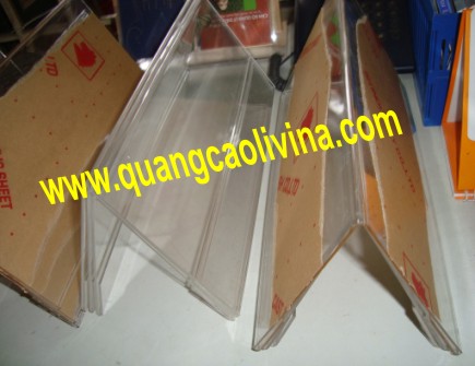 Gia công kệ giá tiền bằng mica trong chữ A,chữ L có sẵn tại Hà nội và TP.Hồ Chí Minh. Kệ giá tiền được sản xuất từ vật liệu mica 2mm, 3mm, 5mm, có kích thước đa dang nhưng phổ biến là kích thước 6 x12cm, 10x10cm. Kệ giá tiền thường được sử dụng ở các siêu thị, các cửa hàng, các showrom nhằm ghi giá tiền của sản phẩm.