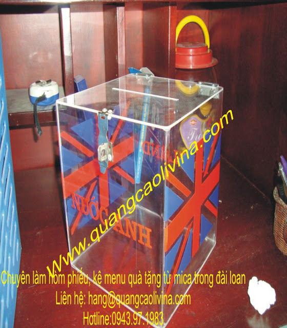 Qúy khách cần mua hòm phiếu tại Hà Nội, nhưng chưa tìm được địa chỉ nhận làm các loại thùng phiếu mica, hòm phiếu mica theo mẫu có sẵn ,hòm phiếu mica , hòm bốc thăm trúng thưởng giá rẻ nhất tại hà nội. Vui lòng liên hệ QUANGCAOLIVINA.COM. QUANGCAOLIVINA.COM là xưởng mica nhận gia công in ấn , cắt khắc mica thành các sản phẩm kệ mica.