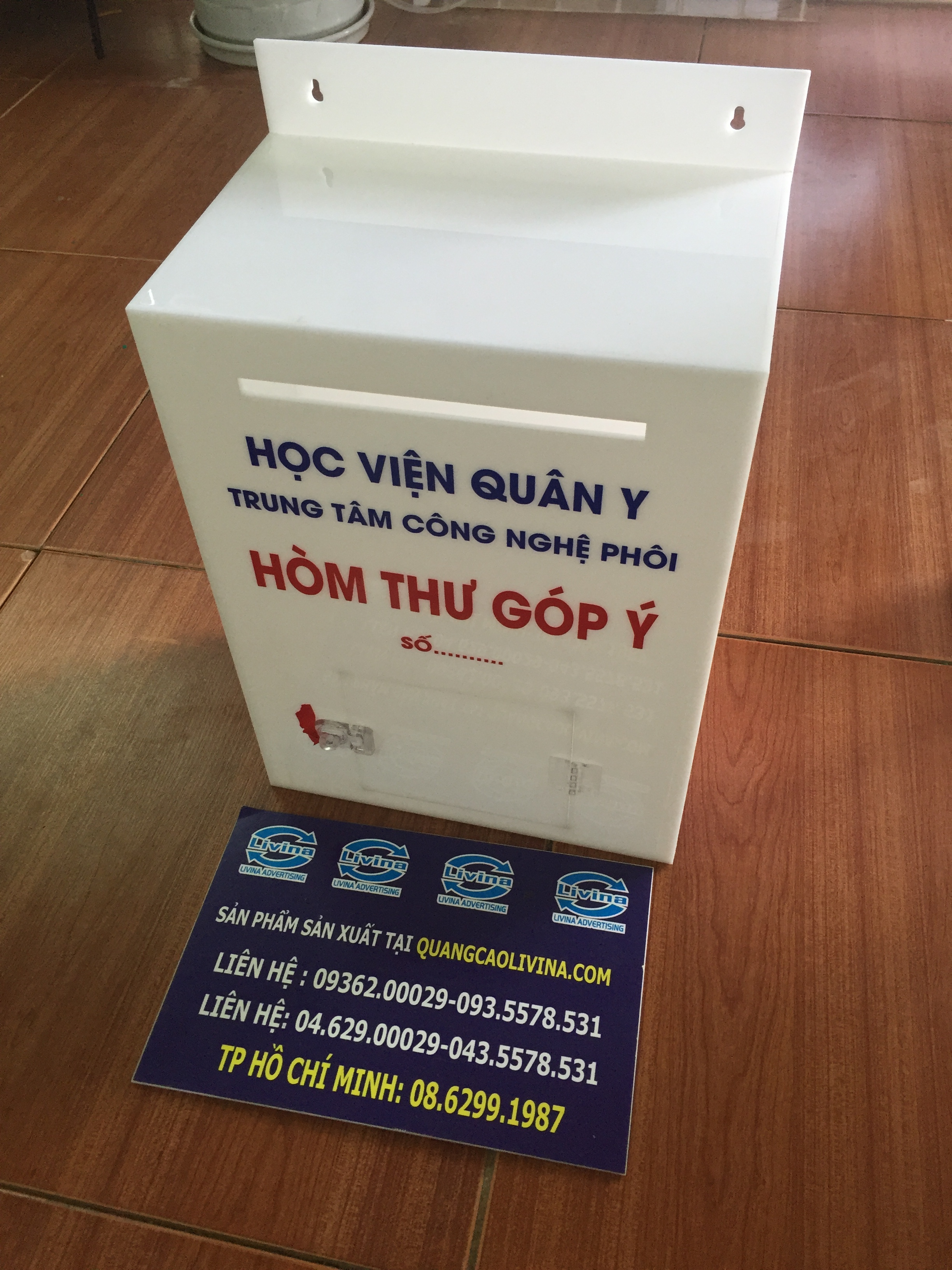 Hòm Thư góp ý mica treo tường bằng mica trong hoặc mica màu có thể in logo lên đã sản xuất ra rất nhiều mẫu mã đẹp mặt về hòm thư góp ý, sản phẩm. Những sản phẩm được sử dụng bởi chất liệu Mica Đài Loan- đây là một loại nguyên vật liệu được sử dụng khá phổ biến trong đời sống con người ngày nay. Mica thường được sử dụng thường xuyên trong quảng cáo, trang trí nội thất. Mica được chế tác ra theo những sản phẩm khác nhay như kệ mica, thùng mica, kệ menu, đựng tờ rơi, đựng tài liệu hay văn phòng phẩm, các loại hòm thư góp ý sẵn tại Hồ Chí Minh.