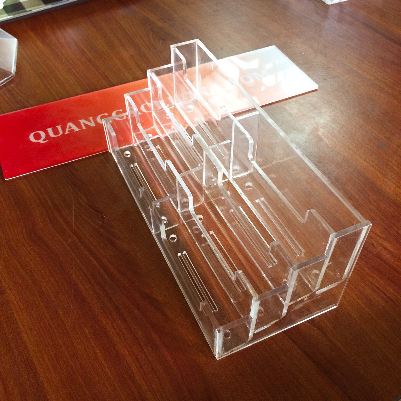 Từ một tấm mica, chúng tôi có những người thợ khéo tay chuyên cung cấp các mẫu mã phù hợp với nhu cầu của quý khách hàng. CHúng tôi là một trong những đơn vị đi đầu trong việc gia công các sản phẩm bằng Mica với giá rẻ đảm bảo chất lượng.Để có những sản phẩm như mong muốn, những người thợ thiết kế của chúng tôi phải trải qua quá trình gia công các sản phẩm, từ những tấm mica, để có thể cắt, ghép, dán bằng keo chuyên dụng để có thể ra sản phẩm các sản phẩm kệ card visit mica.