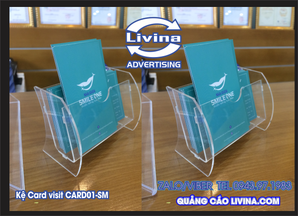 Kệ mica để name card hoặc card visit hay còn gọi là danh thiếp là loại kệ được dùng thông dụng nhất hiện nay tại các công ty. Loại kệ này thường có nhiều ngăn nhiều tầng, tuy nhiên cũng có loại chỉ có một ngăn nhỏ ngọn chuyên dụng để đặt những tấm danh thiếp vào.