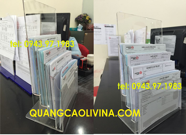 QUANGCAOLIVINA.COM chuyên sản xuất các sản phẩm kệ mica A4 theo mẫu, cung cấp các sản phẩm: kệ mica a4 menu cho quán café, kệ mica a4 để bảng lãi suất ngân hàng, hộp A4 để bàn nhiều ngăn để chứng từ, giấy tờ , form mẫu