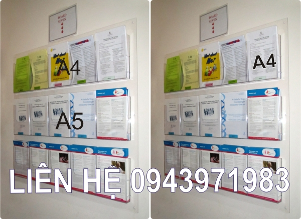 Kệ mica A4 treo tường tại các sảnh văn phòng …theo hình ảnh, thiết kế theo ý khách hàng. Kệ mica A4 trong các kích thước : kệ mica A4 3 ngăn, kệ mica A4 4 ngăn, Kệ mica A4 5 ngăn . Kệmica a4 để bàn và kệ mica a4 treo tườnglà thiết kế thông dụng nhất, giúp choviệc lưu trữ tài liệu dễ dàng và thuận tiện cho người dùng, không những vậy còn đem lại sự sang trọng, tiết kiệm diện tích đặc biệt kệ mica quảng cáo tốt cho các sản phẩm. Kệ mica A4 có thể được gia công, trang trí, in ấn, logo hoặc hình ảnh sản phẩm.