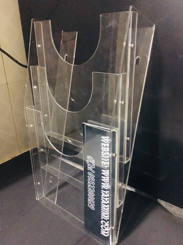 Kệ mica treo tường 2 ngăn ngoài việc dùng để đặt các thông báo, công văn giấy tờ nội bộ, còn có thể kết hợp để các tờ rơi, tờ quảng cáo các chương trình khuyến mại cho khách hàng tại ngân hàng, quầy lễ tân của bệnh viện, quầy lễ tân khách sạn nhà hàng.