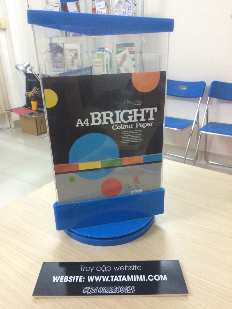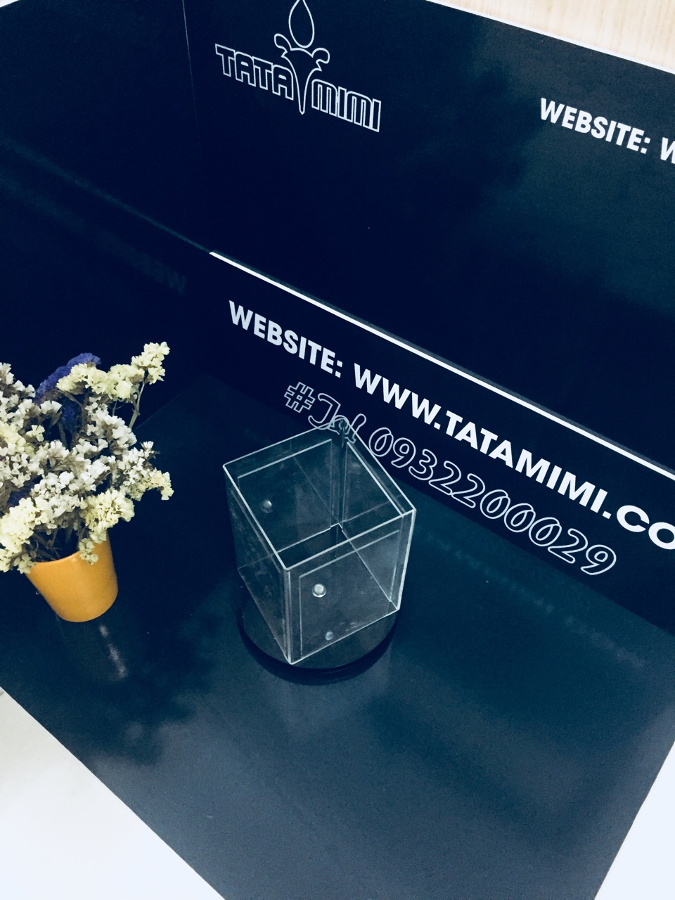 TATAMIMI.COM chúng tôi có kệ mica xoay để bàn có đế được làm từ 2 tấm mica xoay màu đen dày 2mm, kích thước đế cao 30cm, ngang 25cm, ssau 25cm. Phần thân có thể được làm từ mica trong, mica màu đen hay màu xanh coban,…. Kệ mica xoay để bàn được thiết kế gồm 16 ô sử dụng trên một kệ với độ rộng 16 hộp là 2cm. Tờ rơi để vào kệ cao 10cm rộng 18cm. Kệ mica xoay để bàn có thể xoay bằng tay khi cần lấy theo mong muốn.