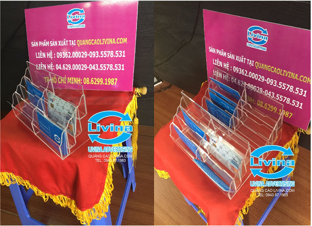 Chúng tôi là địa chỉ gia công mica theo yêu cầu, chuyên cung cấp các sản phẩm kệ mica đựng tờ rơi giá rẻ, kệ tờ rơi, kệ mica có nhiều mẫu mã phù hợp sử dụng trong ngân hàng, nhà hàng, siêu thị, văn phòng, cửa hàng… Kệ mica xoay sử dụng trong các chiến dịch marketing, truyền thông quảng cáo về thông tin về sản phẩm như công dụng chức năng, giá cả, xuất xứ, cách sử dụng, giới thiệu về các dịch vụ của một đơn vị kinh doanh hoặc quảng cáo những mặt hàng đang được giảm giá, khuyến mại tại các siêu thị, cửa hàng,…vv