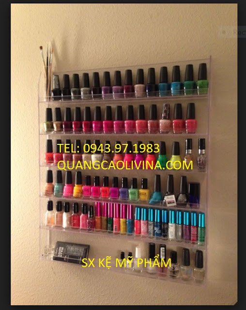 Kệ mica đựng mỹ phẩm là loại kệ được gia công theo yêu cầu thiết kế cụ thể của quý khách hàng. Kệ mica đựng mỹ phẩm thường được trưng bày trong các cửa hàng bán mỹ phẩm, chuyên dùng cho các hoạt động quản cáo các loại sản phẩm và thúc đẩy các sản phẩm phù hợp với nhu cầu.