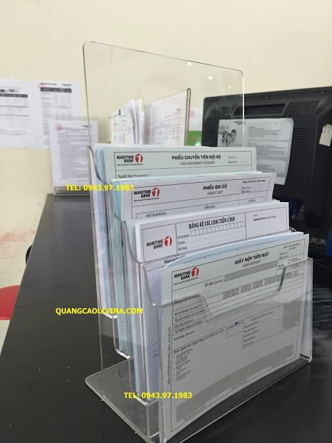 Hiện nay, tại các cửa hàng, văn phòng, siêu thị, khách sạn, quầy lễ tân, trung tâm thương mại, ngân hàng thường sử dụng các loại kệ mica đựng tờ rơi, kệ mica để bàn, kệ mica A5, kệ mica giá rẻ , kệ mica để bàn được sử dụng để đựng các tờ rơi quảng cáo, menu mica ngân hàng để phù hợp với tờ rơi của mình.