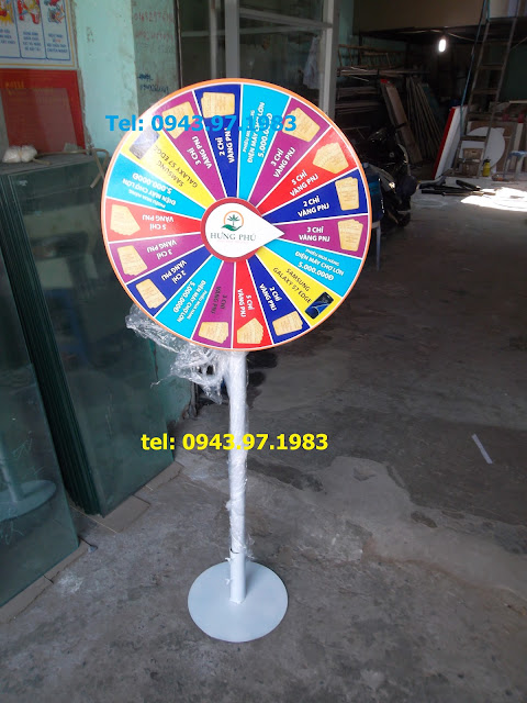 QUANGCAOLIVINA sản xuất vòng quay trúng thưởng phục vụ các sự kiện với những kích thước nào? Vòng quay trúng thưởng có cấu tạo như thế nào ? Cấu tạo của vòng quay may mắn thường được làm bằng gỗ hoặc sắt…Bao gồm một chân trụ và một vòng tròn. Trên vòng tròn thường là cơ cấu giải thưởng và hình ảnh bạn cần truyền tải tới mọi người , nên nó là tâm điểm để bạn thu hút khách hàng của mình. Vòng quay may mắn có nhiều dạng, nhưng được ứng dụng nhiều vẫn là dạng để bàn, dạng đứng và dạng treo tường .Vòng quay may mắn, sản xuất vòng quay trúng thưởng giá rẻ có thể lấy sau bao lâu. Sau khi duyệt market và hoàn thành thủ tục đặt hàng, quý khách có thể nhận bàn giao sản phẩm sau 1 đến 2 ngày.