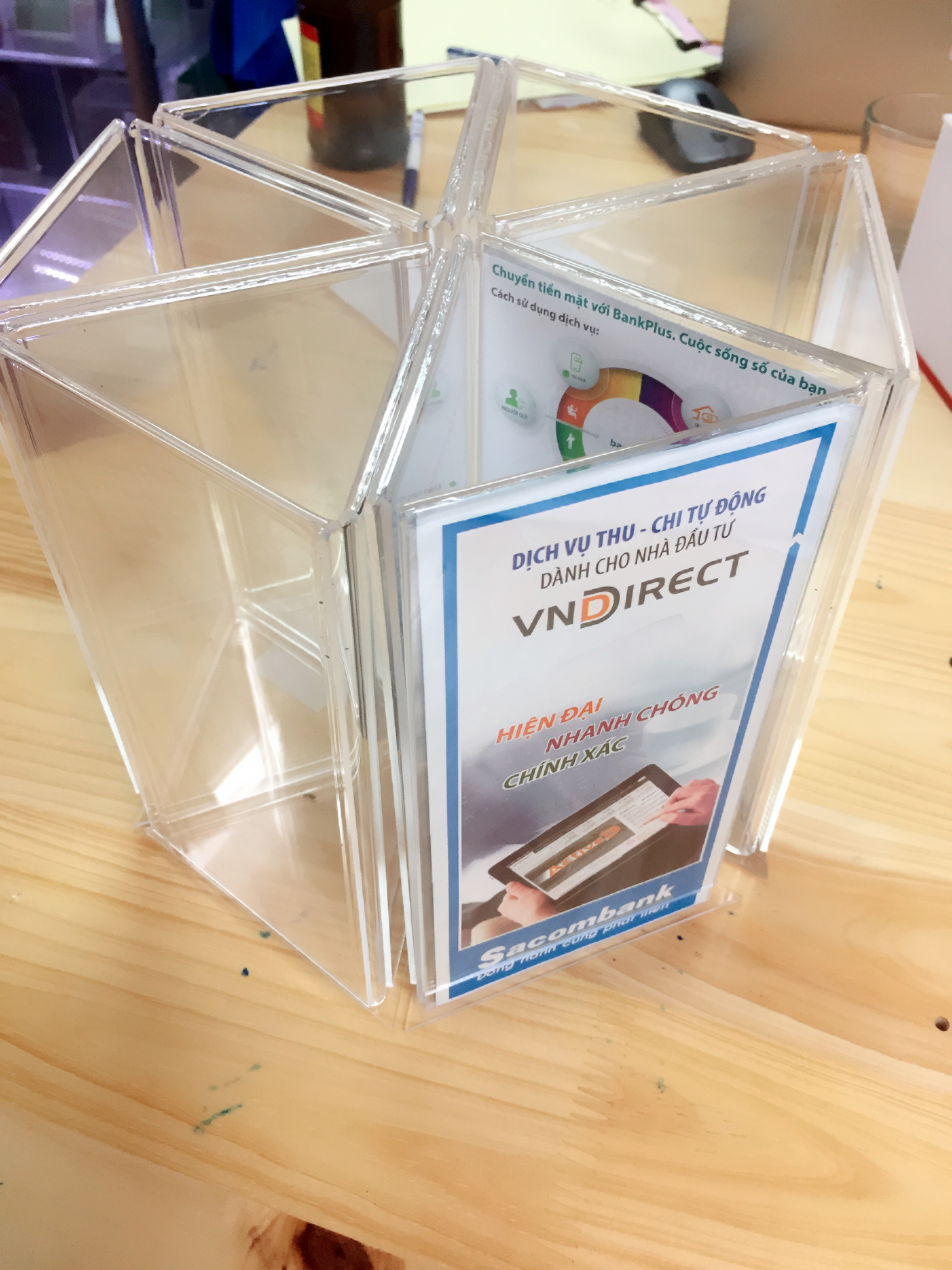 Kệ mica xoay thường được làm từ mica trong có thể kết hợp với mica màu giúp kệ mica xoay thêm nổi bật hơn nhằm lôi cuốn người tiêu sử dụng tiếp cận thông tin nhà quảng cáo.