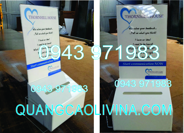 Hòm phiếu mica, đa dạng, đủ kích thước và màu sắc, giá rẻ. QUANGCAOLIVINA.COM bán hòm phiếu, hòm mica, hòm phiếu ... Hộpmica chụp các loại có thể kết hợp với các sản phẩm trưng bày, do có bề mặt sáng bóng nên sản phẩm trưng bày sẽ nổi bật, tăng tính thẩm mỹ hay hòm Phiếu mẫu mới, kết hợp standee, để thể hiện nội dung muốn truyền tải.