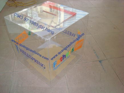 Qúy khách có thể yêu cầu chúng tôi in, dán với hình ảnh khác nhau, chúng tôi nhận trang trí hòm phiếu mica theo đúng chủ đề quý khách đã đặt hàng. Hòm phiếu mica có thể đựng được rất nhiều phiếu khác nhau, quý khách hãy yên tâm về chất lượng mẫu mã của chúng tôi.