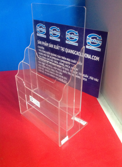 Kệ mica, kệ tờ rơi thường thích hợp dùng cho văn phòng, gia đình,kích thước, số tầng, số ngăn theo yêu cầu của khách hàng,có thể dán decan theo yêu cầu, có kệ để card visit.