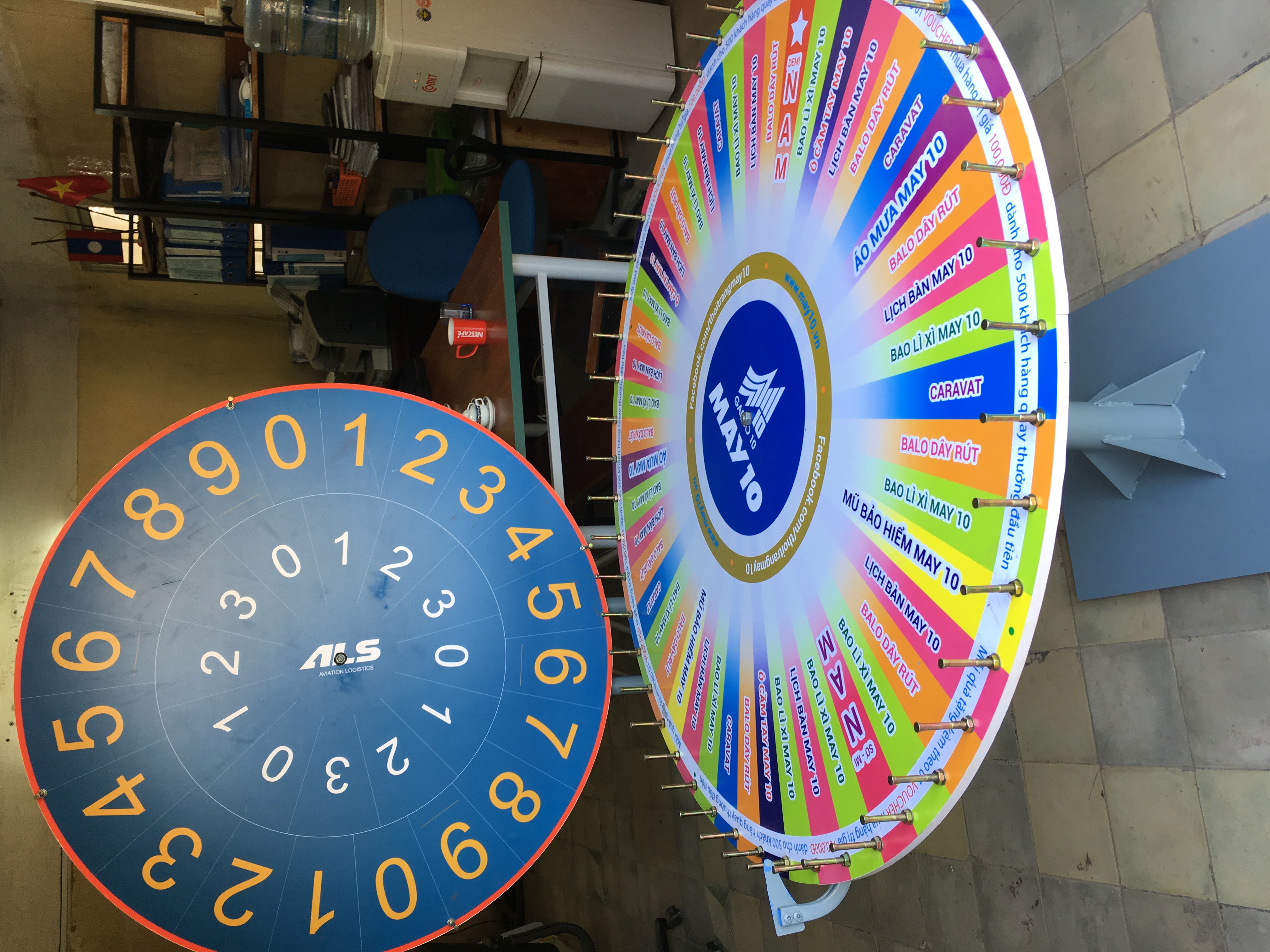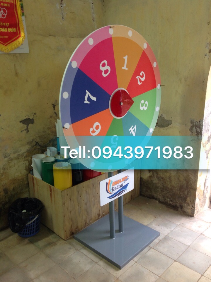 QUANGCAOLIVINA.COM sản xuất vòng quay trúng thưởng phục vụ các sự kiện với những kích thước nào? Kích thước chủ yếu của vòng quay may mắn : mặt vòng quay với đường kính 30cm -60cm, chiều cao chủ yếu là 70 cm- 170 cm. Thân vòng quay được làm bằng 2 vật tư chính sắt và gỗ, chúng tôi có phun sơn, chống thấm, chống gỉ. Vòng quay trúng thưởng với 2 loại vòng quay chủ yếu: vòng quay trúng thưởng để bàn, vòng quay trúng thưởng đứng.