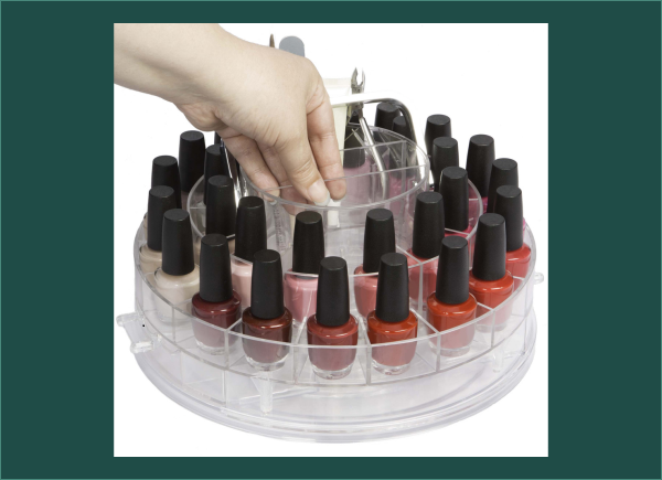 Kệ đựng nước sơn có đế xoay được sử dụng để đựng các lọ sơn móng tay được đặt trên bàn trong không gian các cửa hàng mĩ phẩm,bàn trang điểm tại nhà, trung tâm thương mại,….