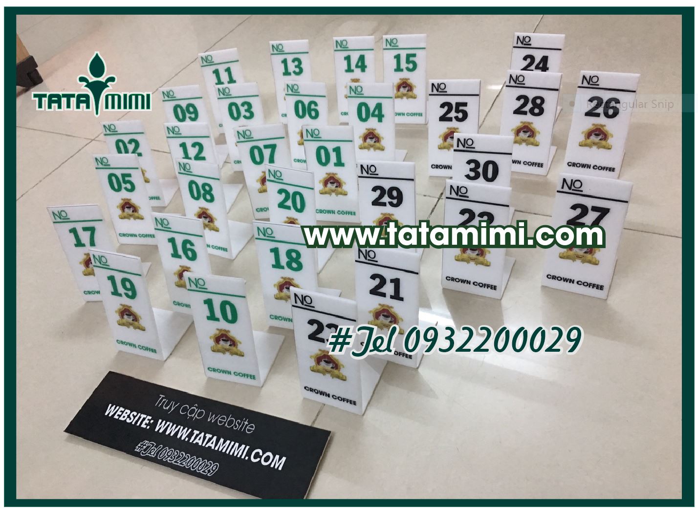 Sử dụng cách in UV lên bề mặt mica 2mm , Logo công ty, tên quán và số thứ tự trên mặt Biển số bàn mica trắng sữa