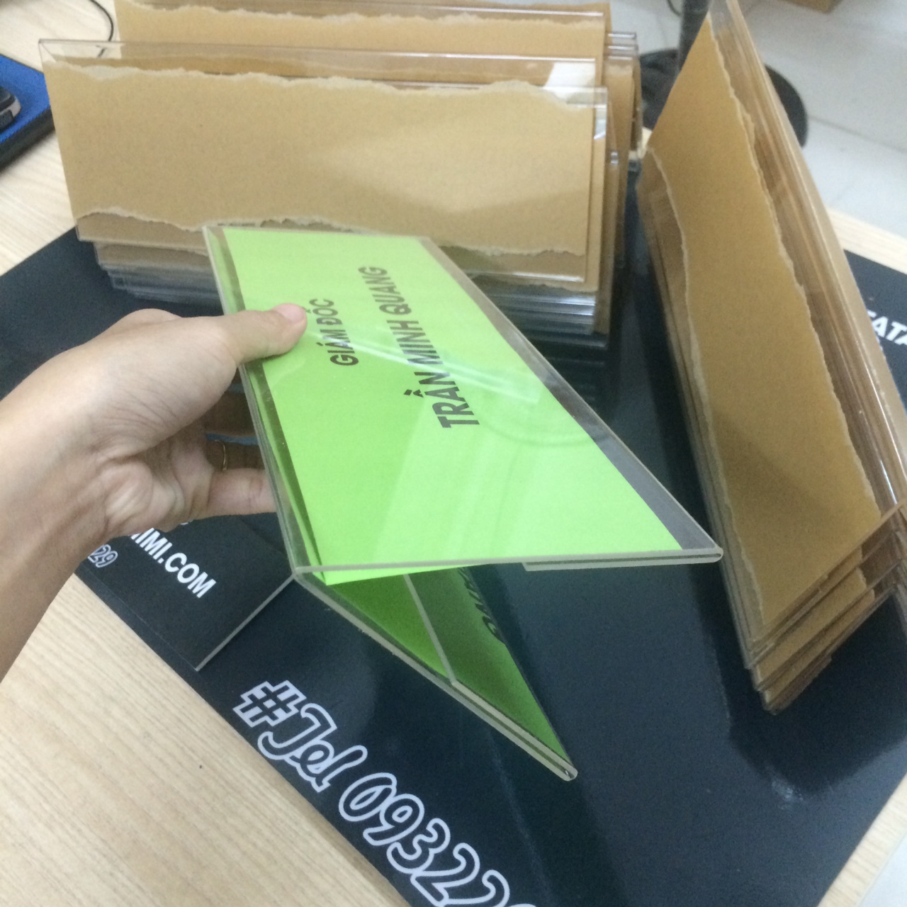 Biển chức danh mica hay kệ chức danh mica là dòng sản phẩm được rất nhiều công ty, tổ chức, nhà hàng sử dụng bởi sự tiện ích và đơn giản của nó. Kệ chức danh mica để bàn kiểu chữ A, thường được làm bằng mica trong suốt dày từ 2 – 3mm tùy theo kích thước mà ta lựa chọn độ dày của mica. Đây là loại biển dùng rất phổ biến trong công ty, nhà hàng , khách sạn… đôi khi còn được sử dụng ở các hội trợ, triển lãm giới thiệu sản phẩm để ghi thông tin của sản phẩm.