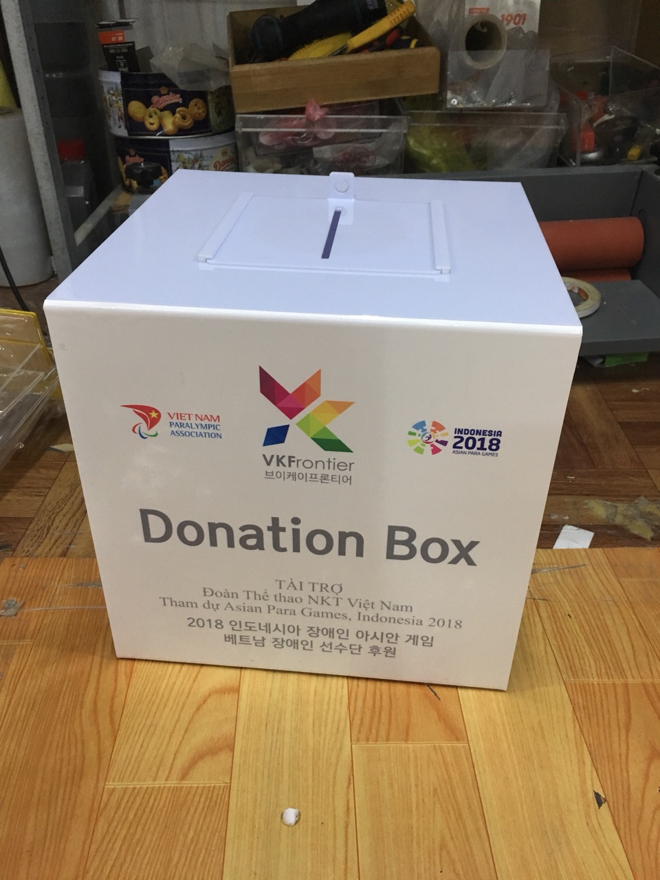 - Hòm mica có thể trang trí logo công ty,tên thương hiệu hoặc tên chương trình