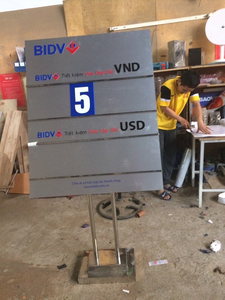 Bảng lãi suất khá chắc chắn, khó đổ vì nó làm bằng chất liệu nặng , được để trước cửa ngân hàng, cửa ra vào gây sự chú ý cho khách hàng mỗi khi đến gửi hoặc rút tiền.
