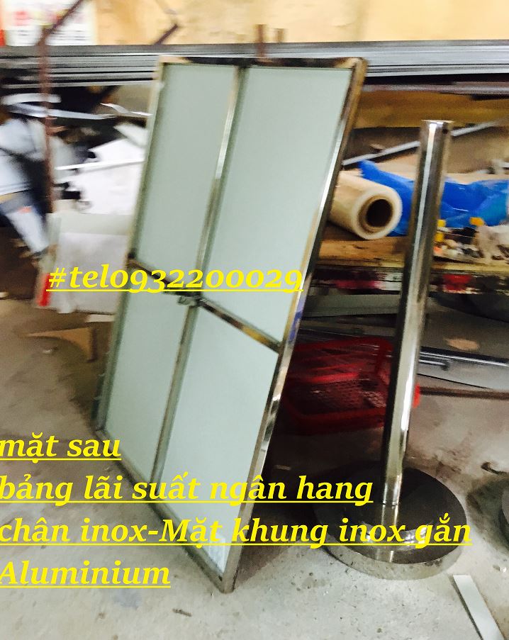 Mẫu biển lãi suất ngân hàng thường sử dụng nhôm aluminium, alu hoặc tôn. Chân làm bằng chột inox tròn, giá đỡ được làm bằng khung đỡ inox, có đế tròn được gia công có lực chịu được trọng lượng của cả bảng lãi suất.